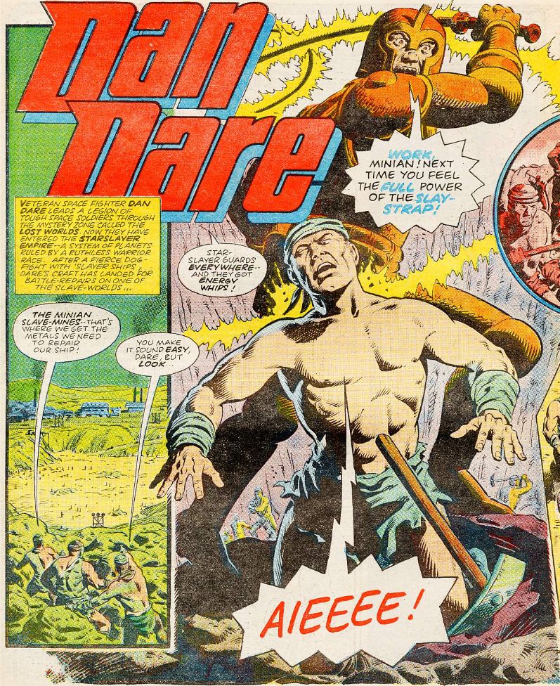For a start, Star Wars has a badly misleading title. Only in its closing act is it any kind of war story, with a heroic rookie pilot making a life or death raid to cripple the enemy’s war machine. Finley-Day’s Dare strips, though, are full of pitched battles. The basic structure of “Star Slayers” finds Dare moving from slave world to slave world, finding a demoralised population and inspiring them to heroic rebellion by some good old Dan Dare grit. It’s repetitive, and if you could bring yourself to take it seriously it might even be uncomfortable: does every alien race long for a gutsy human leader?