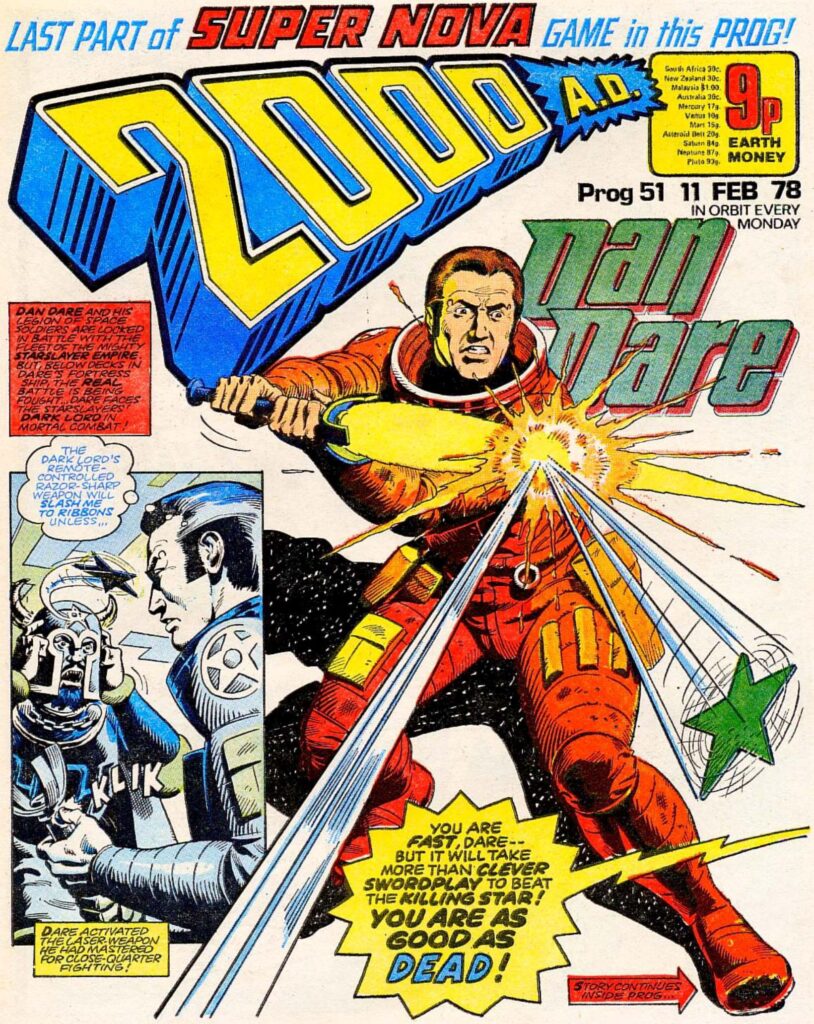 Dare’s position in the comic was always one of symbolism and pragmatism. He was certainly a passion project for artist Dave Gibbons, a boyhood fan of the Eagle, but mostly Dan had been the hook the nascent comic needed to get press coverage (and perhaps loosen a few Dads’ wallets). He was also the most traditional sci-fi story in 2000AD. The idea of a coming wave of interest in sci-fi had been a key argument in getting IPC to launch the comic in the first place. Now, with the UK release of Star Wars in December 1977, the wave was about to break. Dan Dare stood ready.