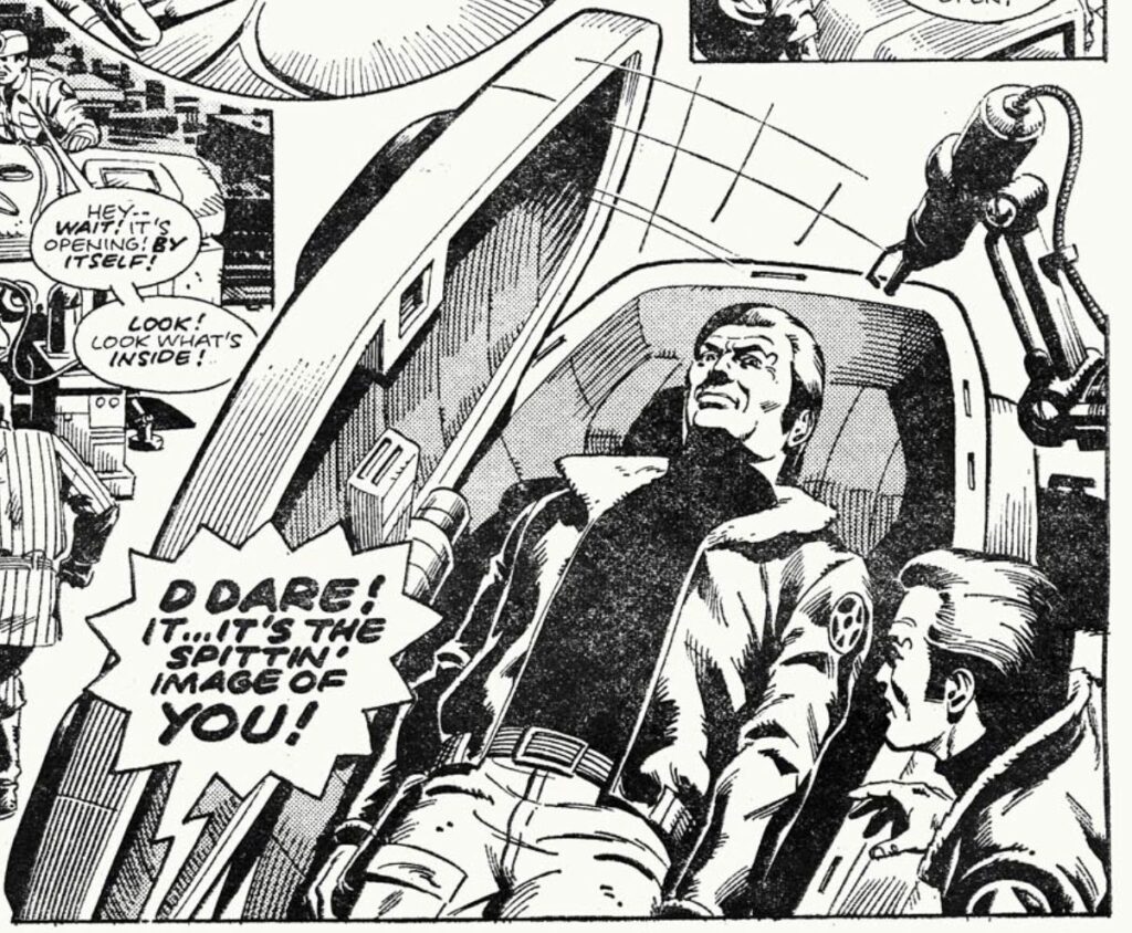 Landau didn’t have a lot of comics experience but he had a taste for edgier, more violent stories where twists and surprises counted for more than sense. His “Doomsday Machine” storyline (with Henry Miller and Roy Preston co-credited) is a narrative mess, full of arbitrary shifts in focus and story elements that go nowhere. And yet however technically incompetent the results are, there’s an intensity to this story of Dare exploring a colossal, abandoned spaceship, drawn by Trevor Goring and Garry Leach as full of shadows and ancient horrors. “The Doomsday Machine” reminds me of the earliest Dare in 2000AD, heavy on spectacle, but with a cosmic horror twist. Even as he throws around fannish in-jokes for the real heads (the lone survivor of an ancient race is called “Moebius”), Landau is at least trying to communicate the sense that a Dan Dare story could have stakes.