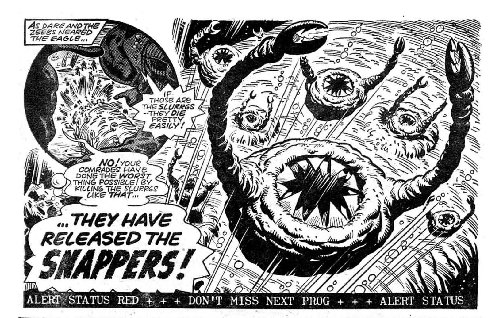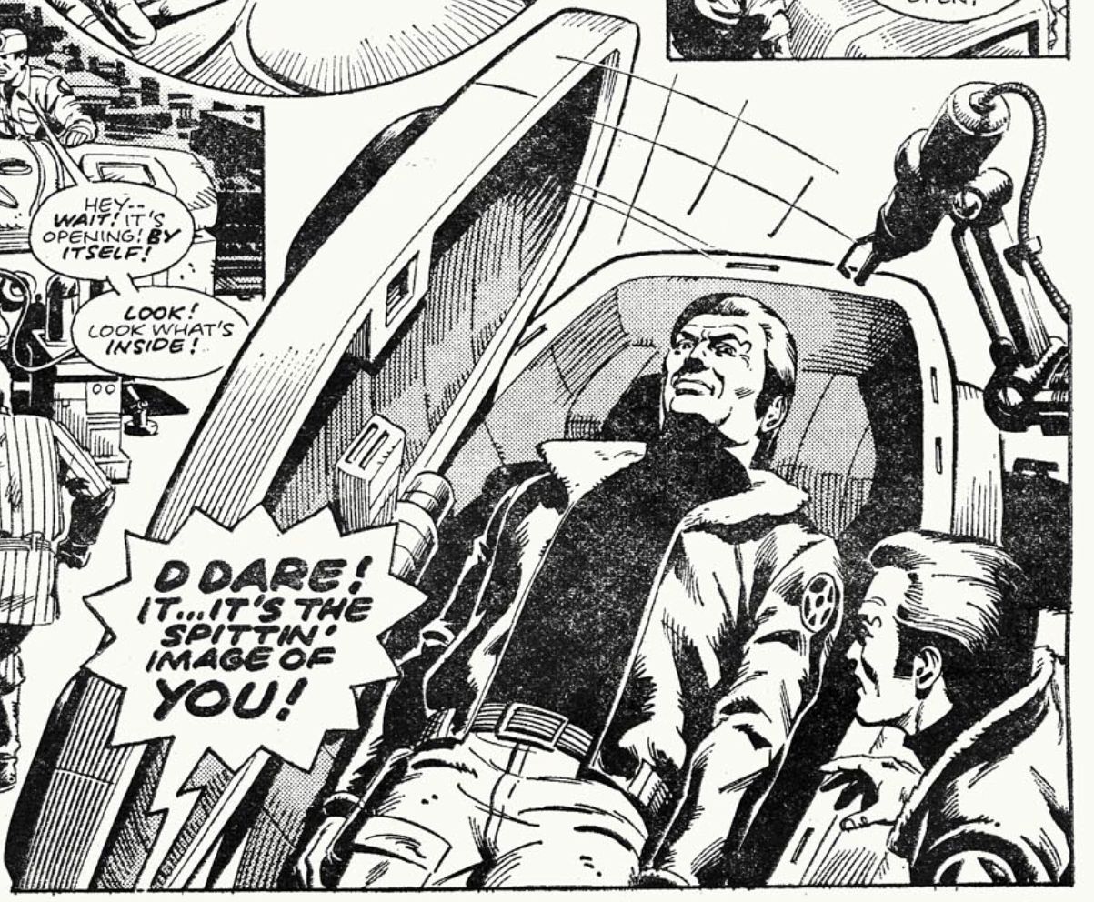 Lowder’s take on Dare is an immediate step up after the starslayers sprawl, opening with a tight story where a floating space sarcophagus unleashes a body-stealing menace on Dare and his crew. Some of the improvement is simply down to Lowder taking more episodes to tell each story: in the opening “Lost Worlds” strips Finley-Day favoured two-partners, which don’t allow much more than a twist and resolution. Lowder’s are often twice as long, which creates a lot more room for the reader to feel like they’re exploring a planet and figuring it out at the same time Dare is.