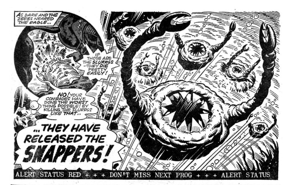 Still, it’s unfair perhaps to criticise Dan Dare for what it isn’t, when his Trek mode does actually deliver entertaining stories. In the last Dare entry I talked about the first bits of the Finley-Day/Gibbons run, where the various pieces – tough guy characters, space opera hardware, whimsical plots – didn’t quite fit together. After the Starslayers story, Chris Lowder (writing as Jack Adrian) becomes the main scripter and the stories find more solid footing.
