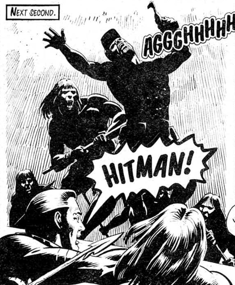 Hitman’s last stand. Art by Trevor Goring and Garry Leach, whose heavy use of shadow gives the final story a particularly doomy air.