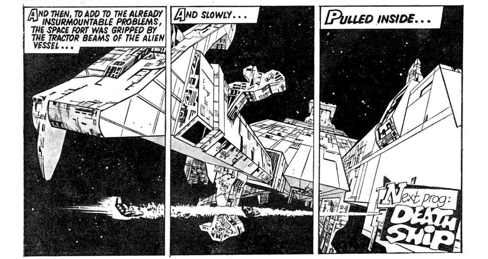 Goring and Leach show Dare’s space fort being pulled inside the Doomsday Machine. Both artists came from fandom, and this is a very 1970s Marvel composition, splitting time across three panels to convey a sense of enormous scale.