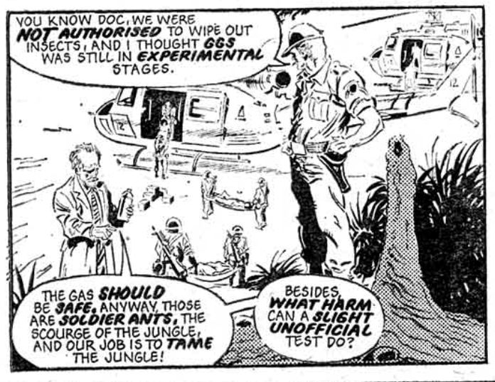 Once the merger date was fixed, the clock could run out on Ant Wars, which bows out with the deaths of Villa and Ant Eater and one final ludicrous contrivance: everyone happily agrees to cover up a US nuclear strike on the Andes. Ant Wars isn’t quite the last hurrah of the creature rampage story – Kelvin Gosnell had a sequel to Flesh ready to take its place – but it’s the end of the standalone B-Movie strips which characterise the Gosnell-Landau editorial era and its conception of science fiction.