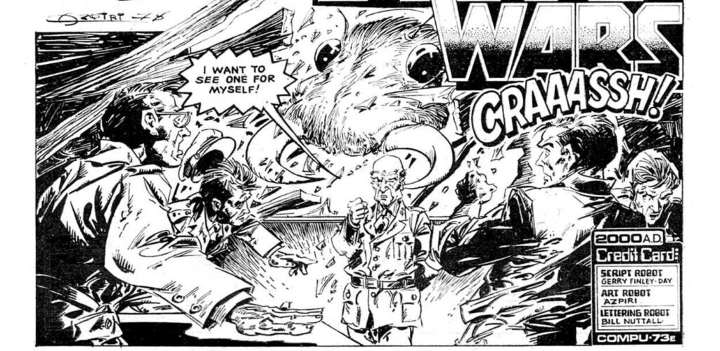 Ultimately the South American setting allows Finley-Day to do the kind of episodic routines he wants – the continent has the right balance of wilderness and city to make a monster threat from the interior work. But as we’ll see repeatedly, early 2000AD has a curious affinity for South America, and particularly for characters where the writers can use a kind of Speedy Gonzalez cartoon accent. (Ant Wars ees spared from thees) The only other nationality which gets this sort of repeated treatment are Japanese characters. Ant Wars isn’t the most egregious example of 2000AD’s love of stereotyping – which is certainly not evenly shared across every writer – but it feels like a good place to start thinking about it.