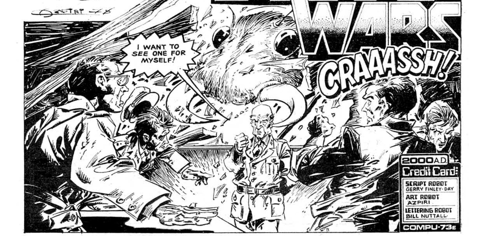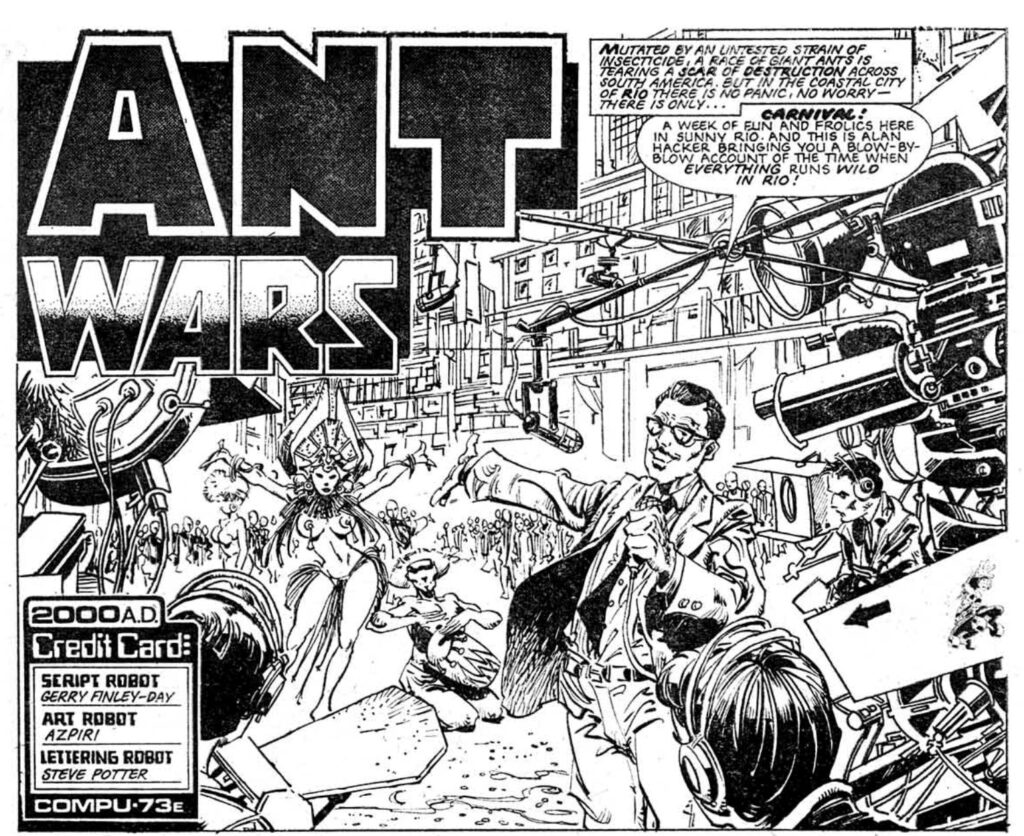 Ant Wars shrugs off its plot holes as easily as the ants later shrug off multiple nuclear strikes, but it’s worth pointing out that this story is unusually ludicrous even for early 2000AD, since that tallies with the rest of what we know about the strip and the editorial conditions when it ran. Ant Wars behind the scenes is best known for an incident described by Kevin O’Neill – the art director at the time – when the strip’s Spanish artist Azpiri sent over his pages for the Rio carnival episode, complete with a prominent topless dancer. O’Neill, who was pissed off with IPC management for their continued interference, chose to let it run to give his senior nemesis Bob Bartholomew conniptions. Bartholomew, apparently, didn’t even notice.
