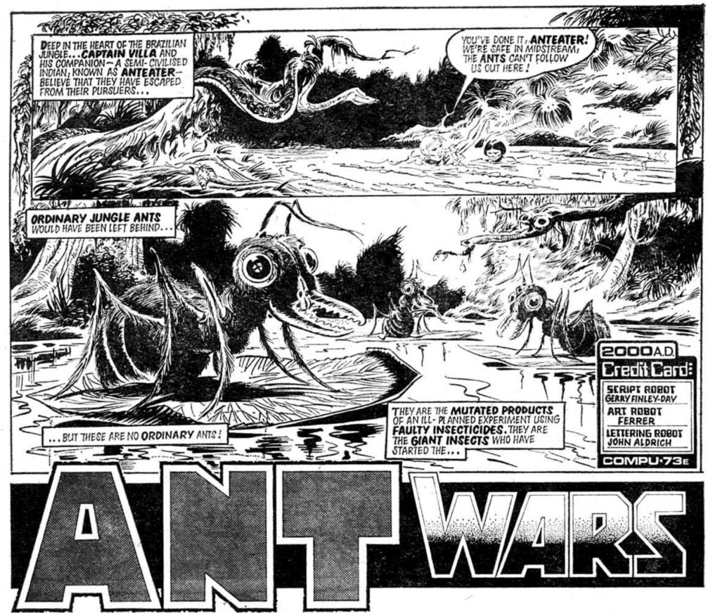 In other words, Ant Wars was being produced at a time of unusual editorial looseness for 2000AD, when – as we’ll see in the Star Lord entries – relationships between staff and management were on the brink of falling apart. This may also be why Finley-Day’s plotting wasn’t better reined in. And I wonder if it may even explain some of what’s going on with “Ant Eater”.