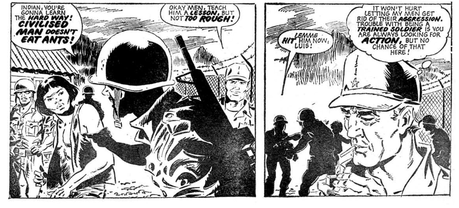 But what stands out for a modern reader is that at no point does Villa ever admit he was mistaken about Ant Eater, let alone apologise or even treat him as much of a person. It’s impossible to imagine a writer doing this kind of plotline now without a beat where Ant Eater tells Villa, or is asked, his actual name, for instance; in Ant Wars we never learn it. It’s worth remembering this storyline was running simultaneously with the Tweak plot in Judge Dredd, which is absolutely explicit that Spikes Harvey Rotten’s very similar prejudices – even unto Tweak’s choice of diet – are stupid. And while Ant Eater gradually gets more articulate as the strip progresses he never graduates to becoming the point of view character in the way Buck Dollar – his closest equivalent in Shako – eventually does. The narrative constantly introduces him as “semi-civilized”, an “Indian” or a “savage”. Which leaves tricky questions about Ant Wars’ actual relationship with its characters’ racism.