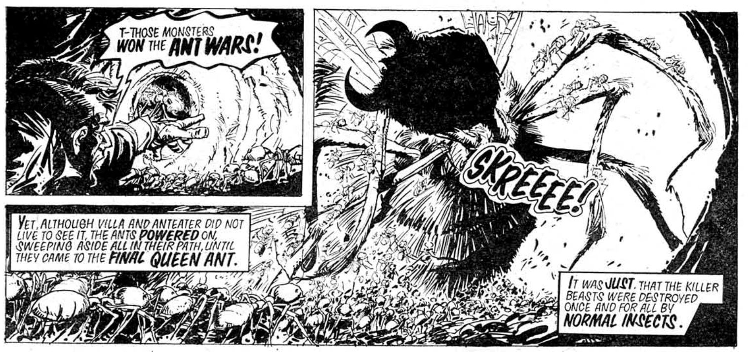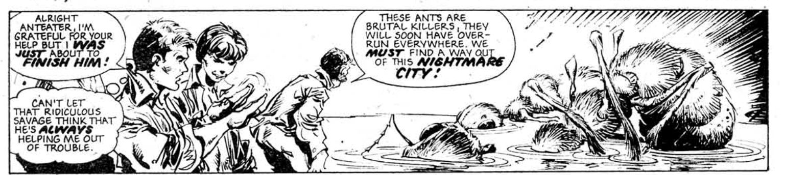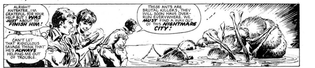 That formula is easy to outline. Every week or two, Captain Villa of the Brazilian army and Amazonian tribesman “Ant Eater” encounter some people who refuse to believe their story of a horde of giant mutated ants. Said horde immediately turns up and eats everyone, except the leads who kill an ant or two and get away. The story climaxes with this playing out in Rio, which the ants entirely sack, except then there’s another several weeks of formic fun as the strip plays its man-eating hits until the Star Lord merger calls a halt to it.