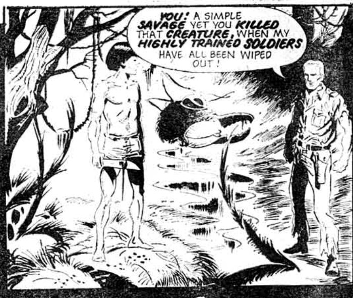 In terms of the strip’s actual action, “Ant Eater” is plainly the hero of Ant Wars – he appears on the story’s introductory cover, a young Amazonian native defiantly holding a spear as a huge ant looms above him and the world. He is also easily the most competent human in the strip when it comes to fighting the ants. What stands out when you read it, though, is his treatment by the other characters in the strip.