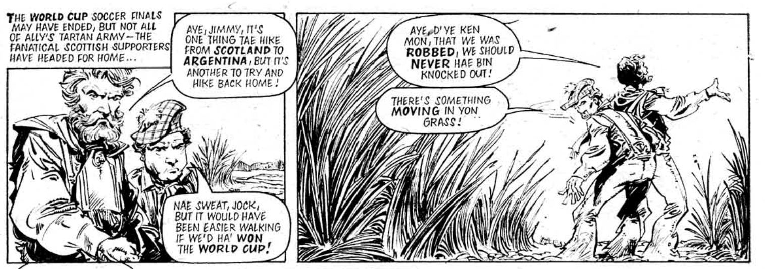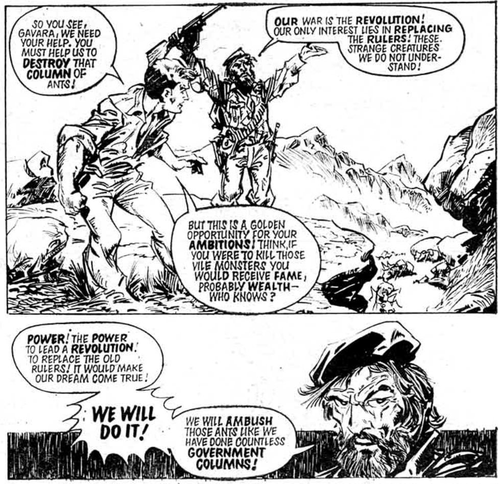Wrapped around the problem of Ant Eater is a whole other set of stereotypes, less difficult to deal with but emblematic of 2000AD’s relationship with the foreign. Ant Wars is wholly set in South America, which means Finley-Day gets to tick boxes on a list of “South American stuff” for the ants to munch through, and have everyone call each other “amigo”. We see Rio carnival! Gauchos! Football fans, since it’s a World Cup year (the football fans, to be fair, are Scottish, and their grim fate is one of the most fondly-remembered elements of the strip). My favourite of all these is a set of gun-toting rebels led by the beret-clad “Gavara”: “the ants are not my enemy!” he declares. But like the government he hates, he too refuses to take the ant threat seriously until it’s too late.