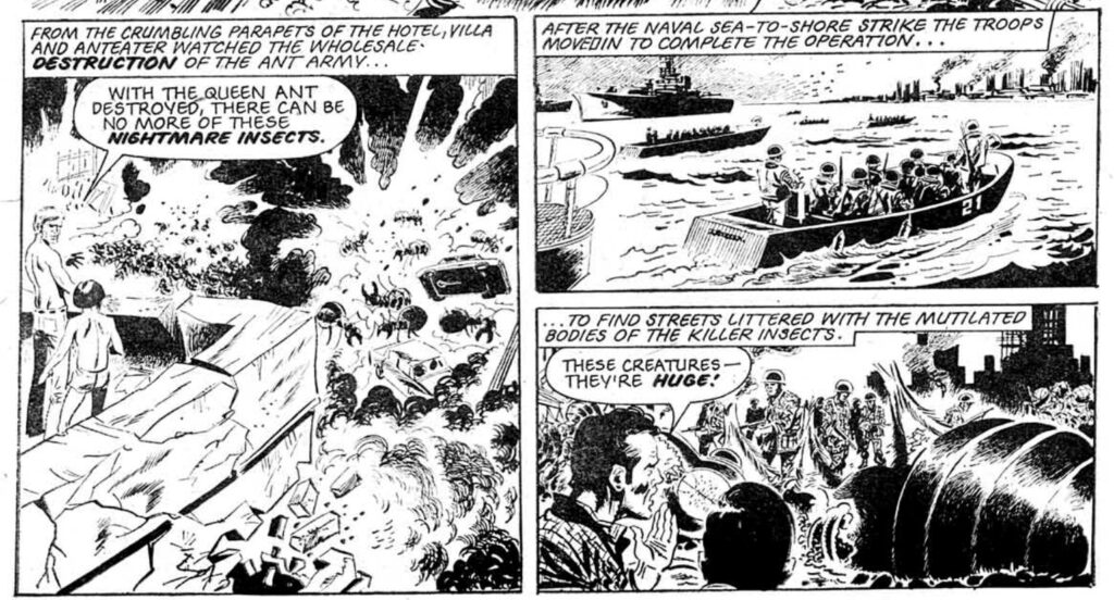 Finley-Day is a lot less interested in the documentary element of his creature feature. In the early episodes of Ant Wars the strip keeps its ants’ behaviour roughly within the bounds of the species’ encyclopaedia entry. But when the story demands the ants be smart, Finley-Day follows the story not the science. A few episodes in they start to make boats out of leaves, and by the time we get to Rio they’re hiding under the wheels of carnival floats to sneak into the city. We see a BBC cameraman filming the resulting slaughter (for Alan Whicker analogue “Alan Hacker”) as the ants destroy Rio. Then we’re told that luckily the incident has been contained and nobody in the outside world knows about it.