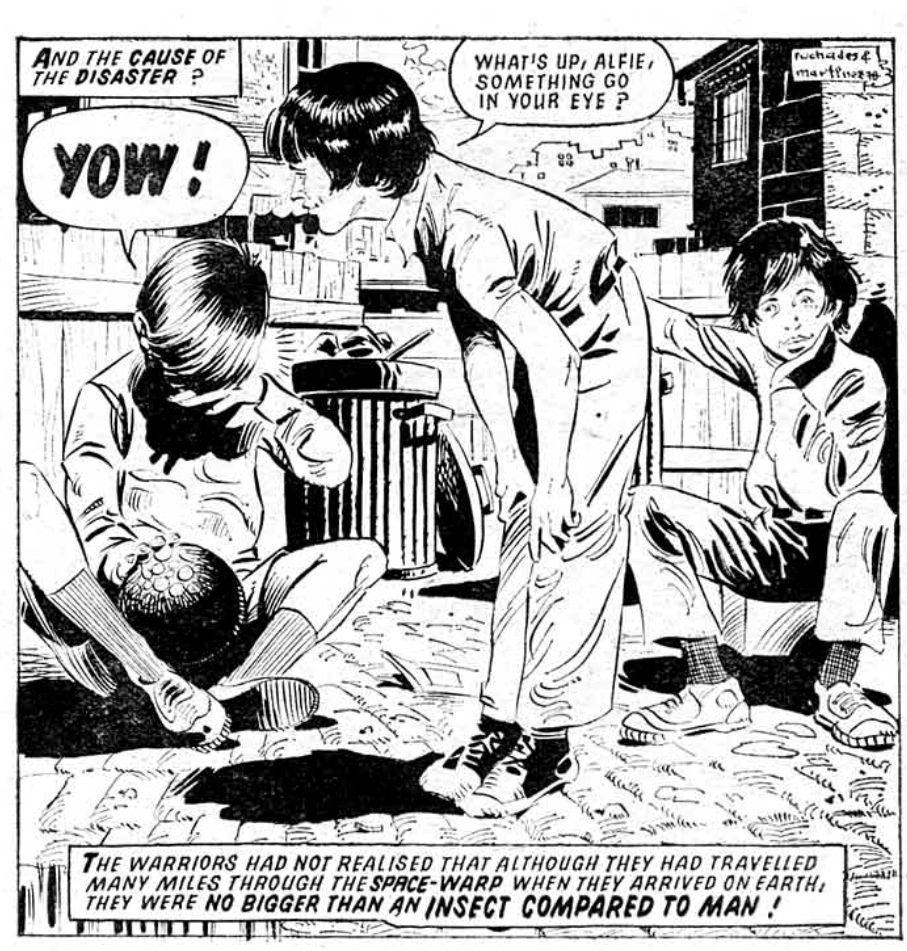Nor was the comic itself. The structure of Ant Wars is unusual – it has a very clear ending 9-10 episodes in with the ant takeover of Rio and our heroes’ destruction of the Queen, but then it just keeps going for another six weeks (more Queens unhelpfully turn up). I’d speculate Finley Day was asked to extend the series and produce more scripts, especially as the false climax happens in the progs that were in preparation when John Sanders of IPC made his final decision on the fate of 2000AD and Star Lord.